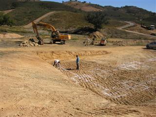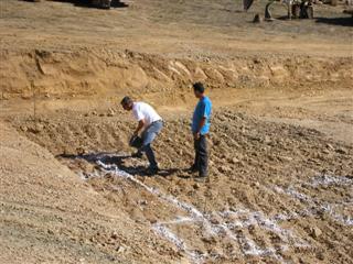 De pilaren die het huis en sanitair moeten dragen worden hier met kalk uitgezet.
