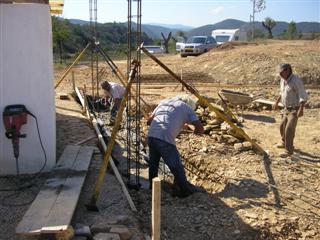 in een verloren uurtje. De pilaren worden vastgezet in de fundering. Het beton wordt